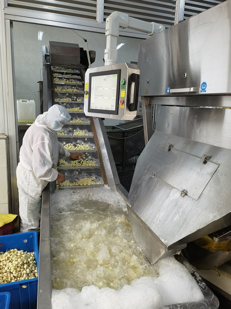 預(yù)處理:清除蒜頭上上附著的泥沙、雜物,減去根須,掰開(kāi)蒜瓣,剝除蒜皮,剔除有病斑、蟲(chóng)眼及干癟顏色的蒜瓣。